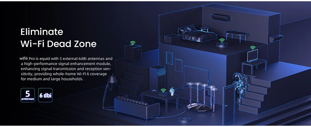 Eliminate Wi-Fi Dead Zone: Wifi6 Pro is equid with 5 external 6dBi antennas and a high-performance signal enhancement module, enhancing signal transmission and reception sensitivity, providing whole-home Wi-Fi 6 coverage for medium and large households.